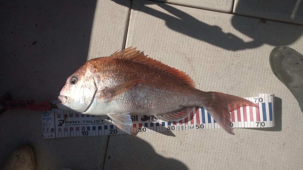 今日は活エビを使ってのエビラバでスタート、前半は厳しく、後半からポロポロと釣れ、鯛・アコウ・マゴチ・キス・ビングシが来てくれました。 大きな鯛は70cm。小さいサイズはリリースありがとうございました。